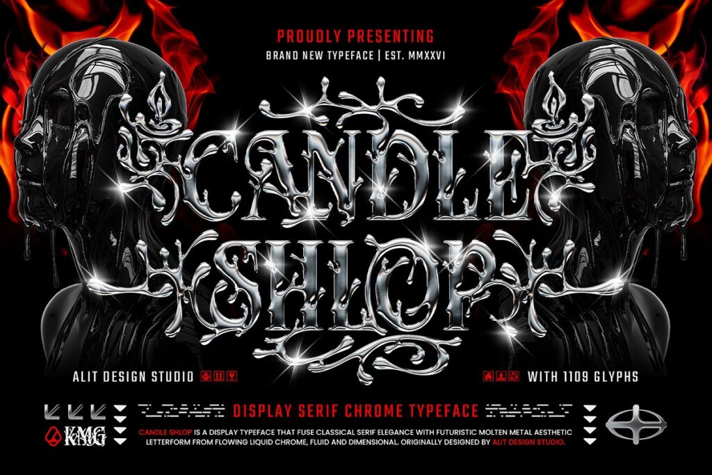 Candle Shlop – Diplay Serif Font is a professionally designed typeface that delivers clarity, structure, and consistent performance across various design applications. Candle Shlop, a groundbreaking display typeface that seamlessly fuses classical serif elegance with a highly futuristic, molten metal aesthetic.