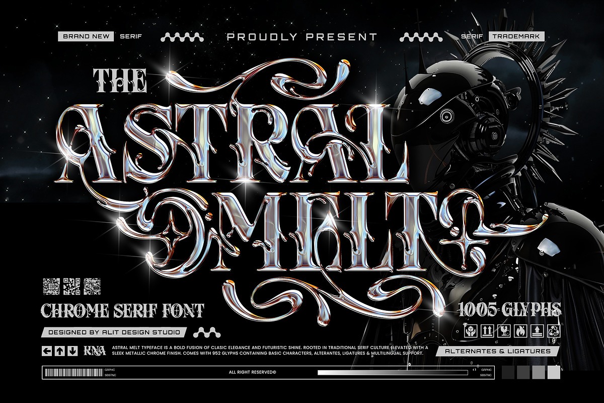 Astral Melt Font, a bold typeface that brilliantly fuses classic typographic elegance with a cutting-edge, sci-fi shine. Rooted in traditional serif and gothic blackletter culture, Astral Melt is elevated by a sleek, molten aesthetic that feels like flowing liquid metal.