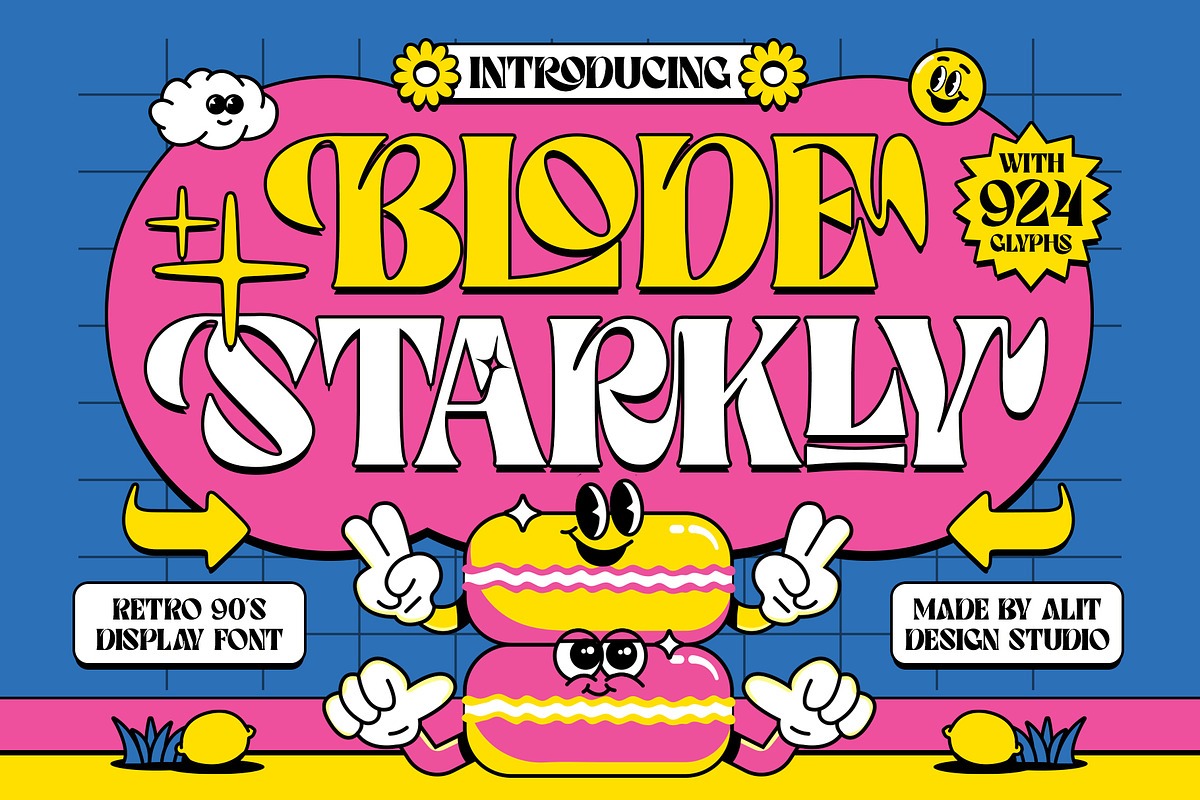 Step into a time machine and bring the vibrant, groovy energy of the 90s back to the future! Blode Starkly is not just a font; it’s a total design experience. Inspired by the playful, trippy, and expressive “Rubber Hose” and “Psychedelic” art styles, this typeface is designed to make your projects pop with personality and a touch of vintage nostalgia.