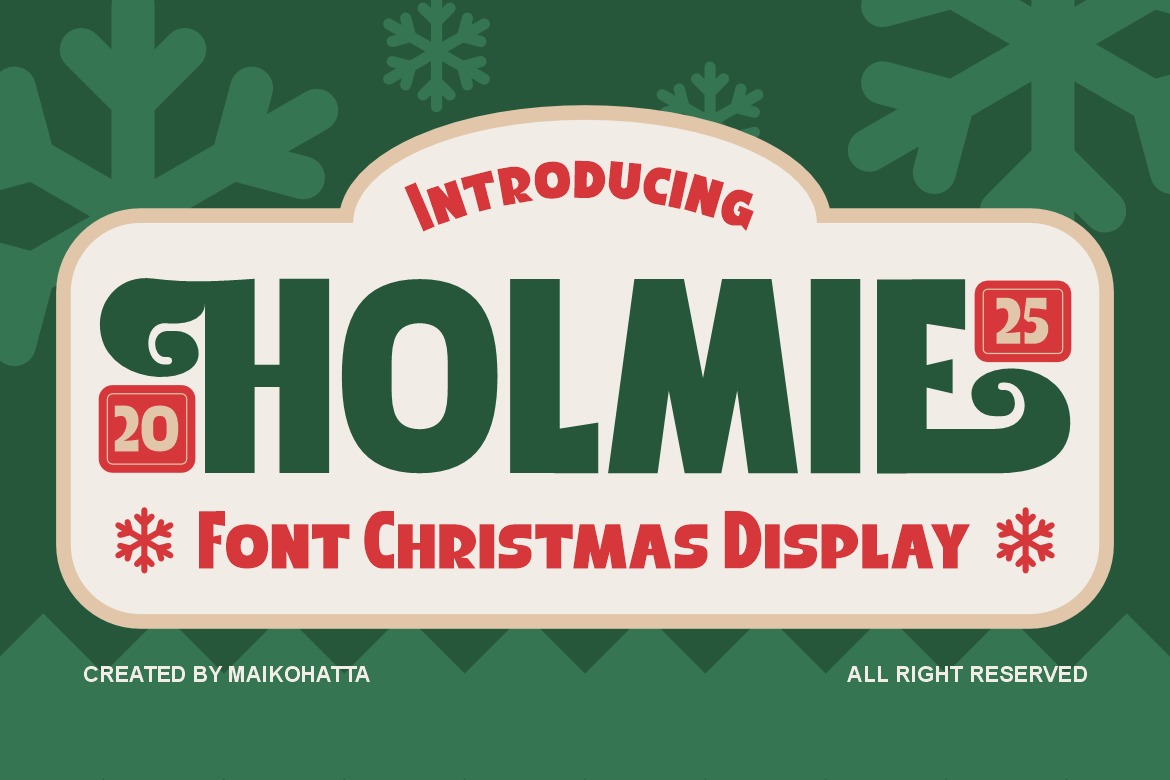 Holmie Font is a cheerful and festive Christmas display font designed to bring warm holiday vibes to any project. With bold letterforms, playful curves, and decorative swirls, this typeface captures the joyful spirit of winter celebrations. Its retro-inspired shapes and cozy handcrafted feel make it perfect for Christmas cards, gift labels, posters, branding, packaging, social media, and all your holiday-themed designs.