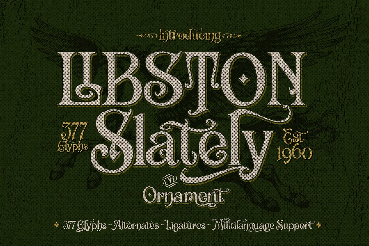 With Bonus ornaments & catch words perfect for high-end branding, wine labels, packaging, logos, editorial layouts, and vintage-inspired designs, Libston delivers a strong historical character with modern usability