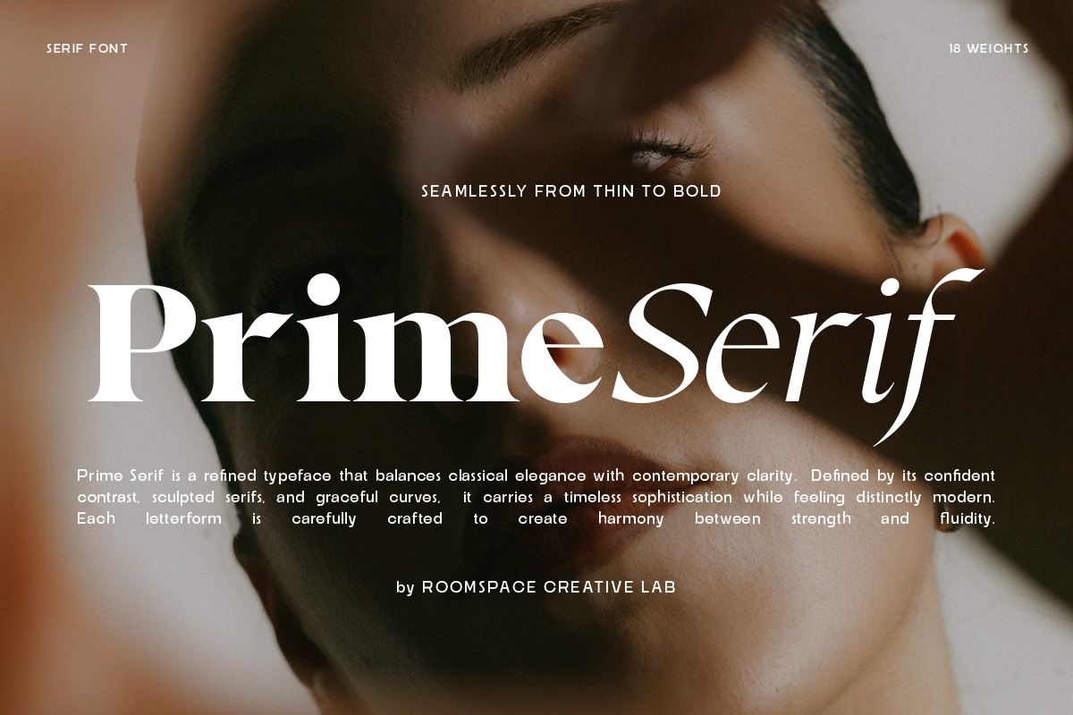 Prime Serif – Modern Serif Font is a versatile font designed to adapt beautifully across different design styles, offering dependable readability and balance. PrimeSerif is a modern serif typeface designed to balance classical elegance with contemporary clarity. Featuring sculpted serifs, graceful curves, and confident contrast, this typeface creates a refined typographic presence ideal for luxury branding, magazine headlines, and premium visual identities. With 18 weights ranging from Thin to Bold, Prime Serif offers exceptional flexibility for both display and editorial typography while maintaining harmonious readability. Perfect for designers seeking a sophisticated serif that feels both timeless and modern.