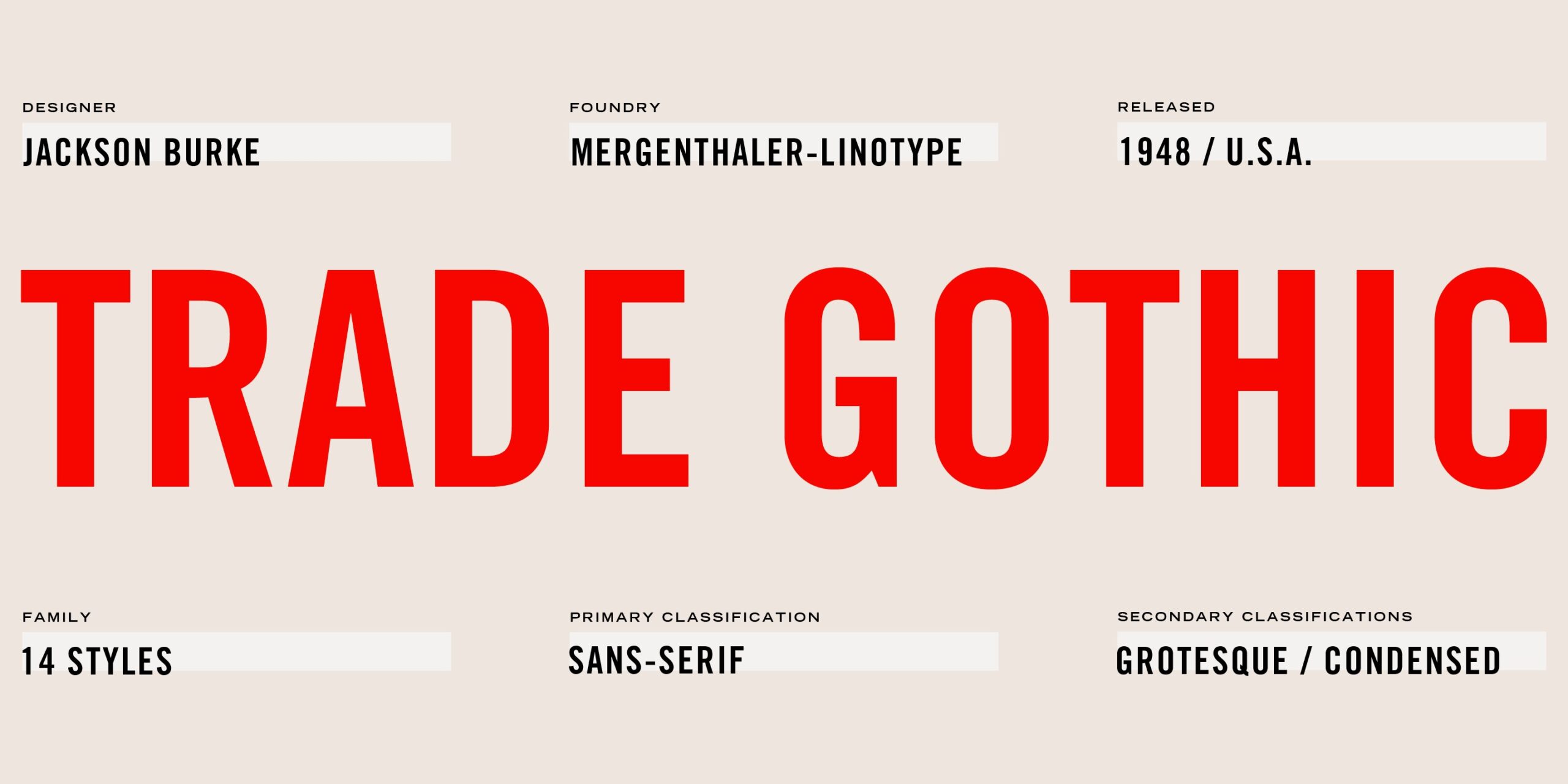 Trade Gothic Font Family is a clean and thoughtfully built typeface that works seamlessly for both professional branding and everyday creative uses. The first cuts of Trade Gothic were designed by Jackson Burke in 1948. He continued to work on further weights and styles until 1960 while he was director of type development for Mergenthaler-Linotype in the USA. Trade Gothic does not display as much unifying family structure as other popular sans serif font families, but this dissonance adds a bit of earthy naturalism to its appeal. Trade Gothic is often seen in advertising and multimedia in combination with roman text fonts, and the condensed versions are popular in the newspaper industry for headlines.