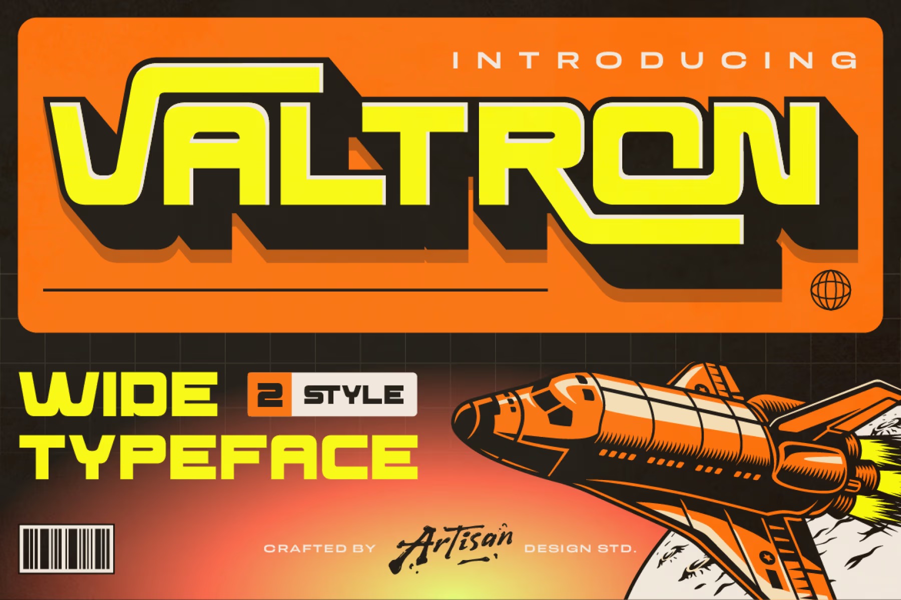 Valtron Font is a stylish typeface that enhances visual appeal and works effortlessly in many design contexts. Valtron is a bold wide typeface inspired by retro-futuristic sci-fi visuals and space exploration aesthetics. With its strong geometric shapes, wide proportions, and sharp cuts, Valtron instantly delivers a powerful, futuristic vibe. This font comes with 2 styles: Regular and Extrude, allowing you to create depth, dimension, and eye-catching typography. It also includes ligatures and stylistic alternates, giving you more flexibility to customize your lettering and create unique logotypes or headlines. Valtron works best for sci-fi branding, futuristic logos, posters, game titles, space-themed designs, album covers, and bold display typography. Whether you want something loud, modern, or cosmic, Valtron is built to stand out.